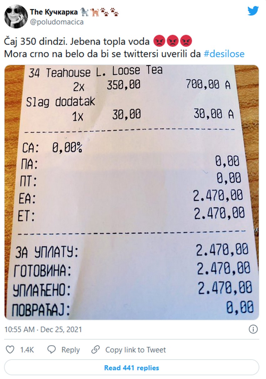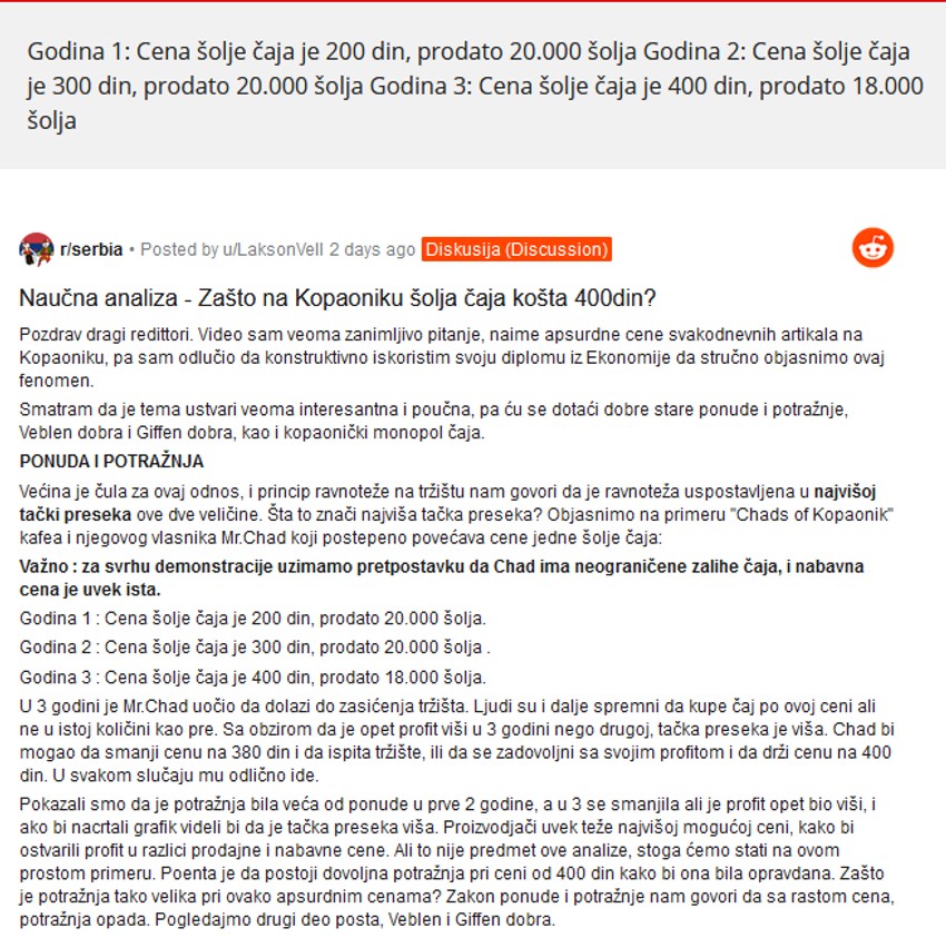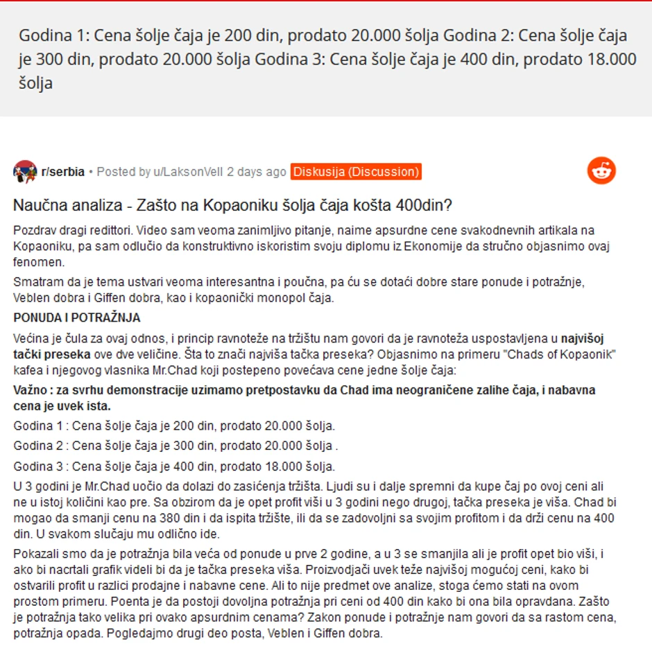 Da, postoje kafići koji prodaju po "normalnim cenama" bilo iz moralnih razloga ili iz straha da povećaju cene. To nije predmet ovog posta. Poenta je da postoji potražnja za datu ponudu. Stoga, uživajte u čaju od 400 din!”, završava on.