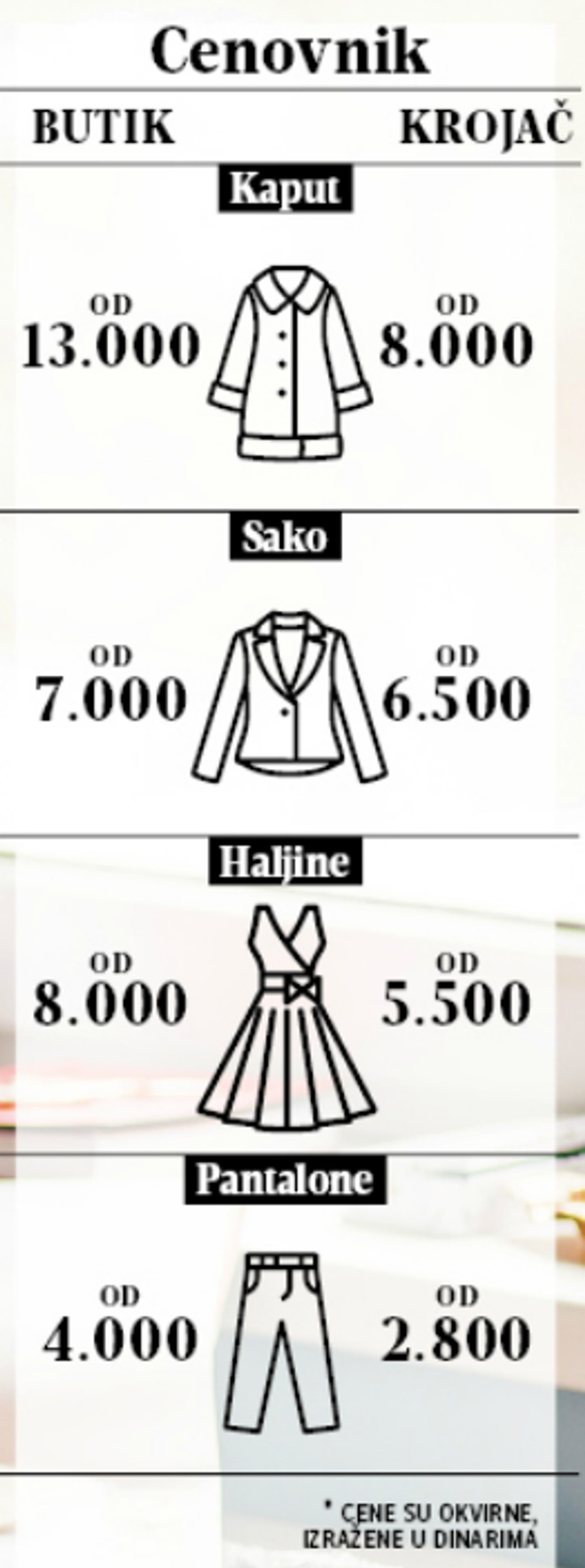 Razlika je i kod pantalona i košulja koje su u radnjama u proseku oko 4.000 i 5.000 dinara, a kod krojačica taj komad izađe oko 2.800.