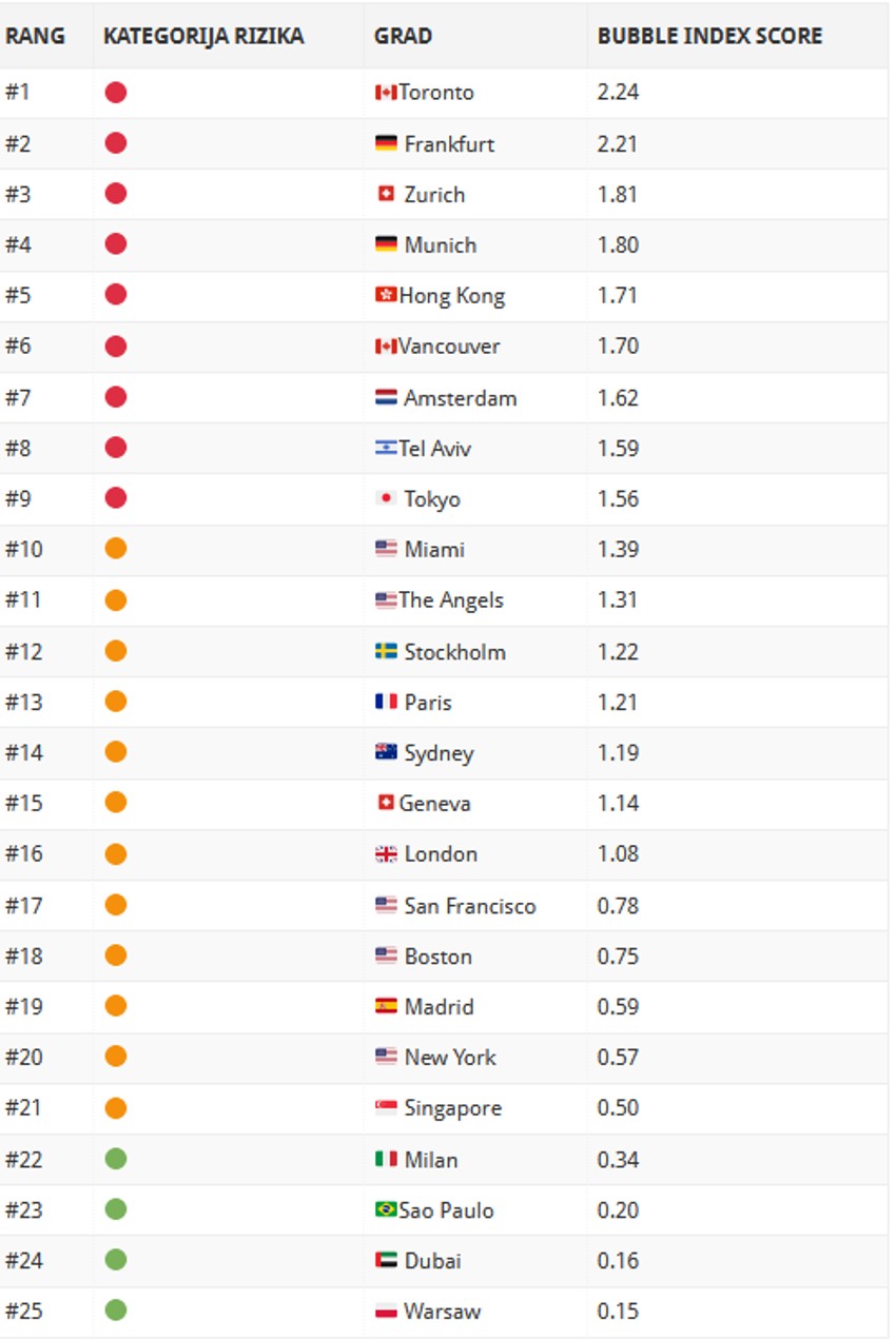 Najveći kanadski grad nalazi se na vrhu liste na kojoj nijedan grad ne želi da završi. Cene kuća u Torontu stabilno rastu već godinama, a mnogi, uključujući UBS, veruju da je grad sada čvrsto na teritoriji mehura.
