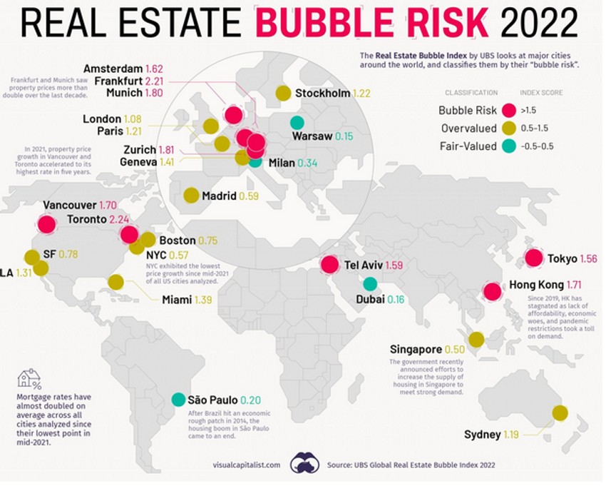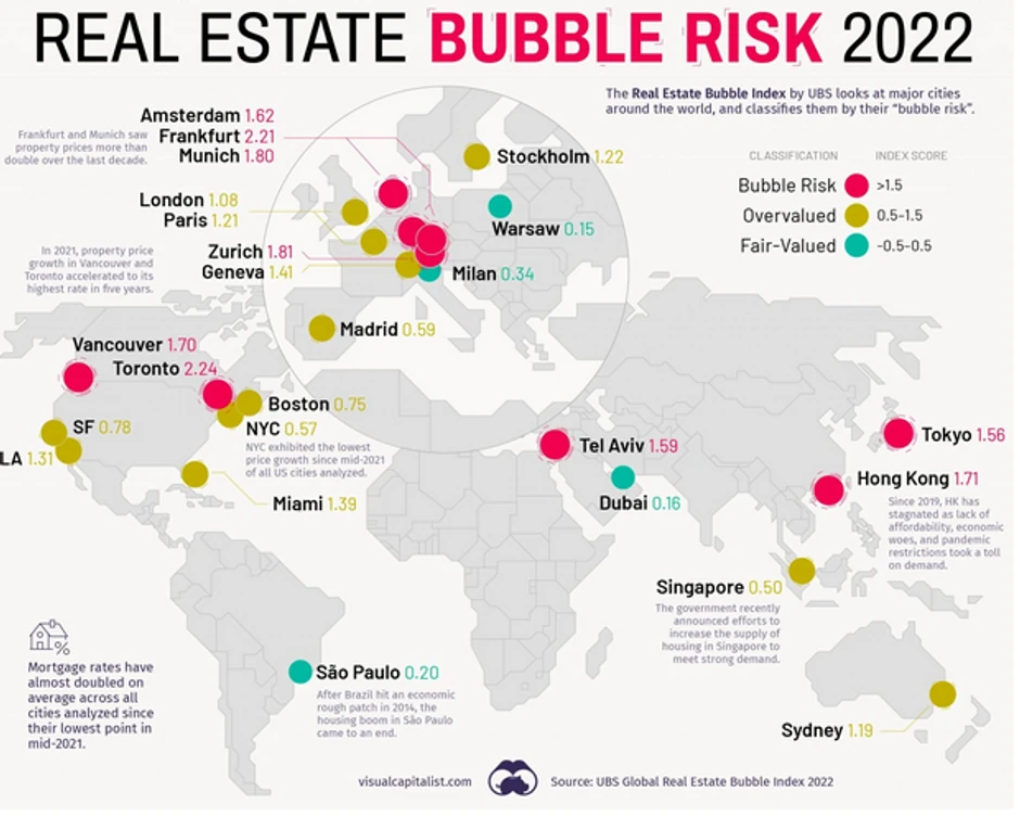 Prikazana infografika zasnovana je na podacima UBS indeksa nekretnina , ispituje 25 globalnih gradova, bodujući ih na osnovu njihovog rizika od mehura.