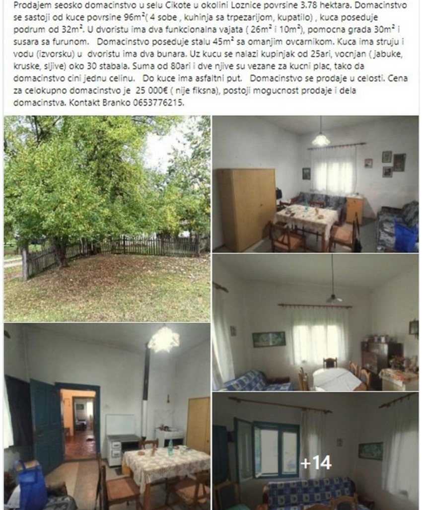 Drugi oglas podrazumeva ponudu za celo seosko domaćinstvo u okolini Loznice po ceni od 25.000 evra. Nudi se 96 kvadrata kuće s podrumom od 32 metra kvadratna, a pored toga dva bunara, dva vajata, sušaru, furunu, štalu, šumu, kupinjak, voćnjak, njive, a ima i asfaltni put.