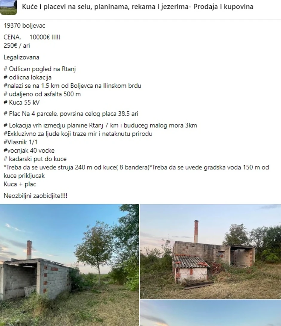 Jednu takvu u oglasu našli smo u podnožju planine Rtanj. Kuća ima i skoro 40 ari, a cena je samo 10.000 evra. Kuća je, ističe se, u početnoj fazi gradnje.