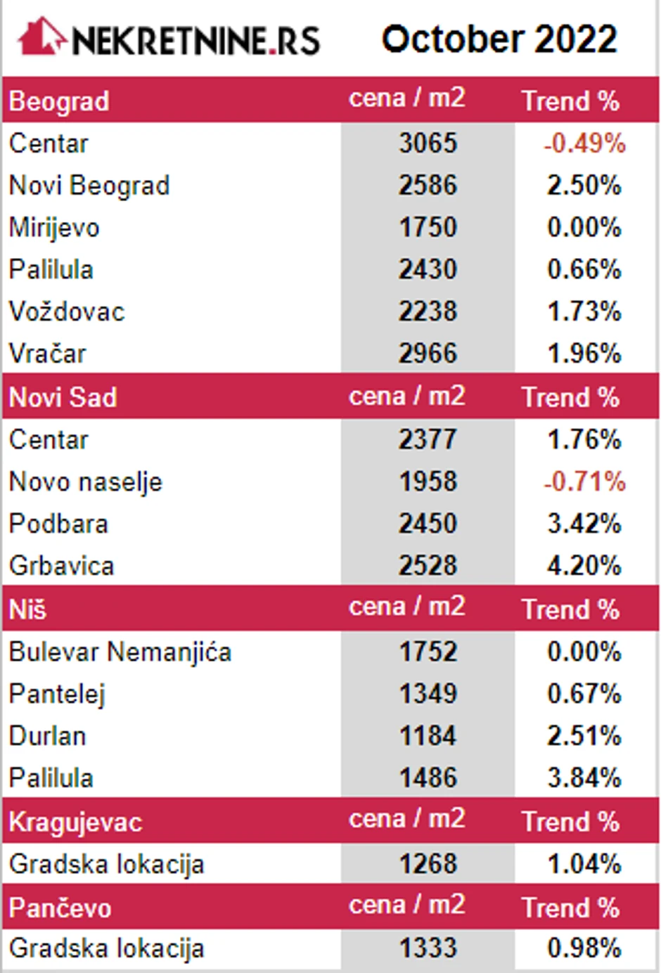 Prema podacima portala Nekretnine.rs, cene stanova u Kragujevcu i Pančevu u periodu od septembra do oktobra povećale su se za 13 evra. Prosečna cena kvadratnog metra nakon oktobarskog poskupljenje u Kragujevcu je 1.268 evra dok je u Pančevu 1.333 evra.
