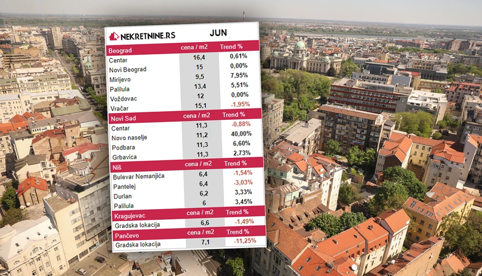 Precizne podatke o kretanju cena i trendovi rasta prosečnih cena stanova u junu možete videti u priloženoj tabeli, koja je formirana prema oglašenoj ponudi na portalu Nekretnine.rs: