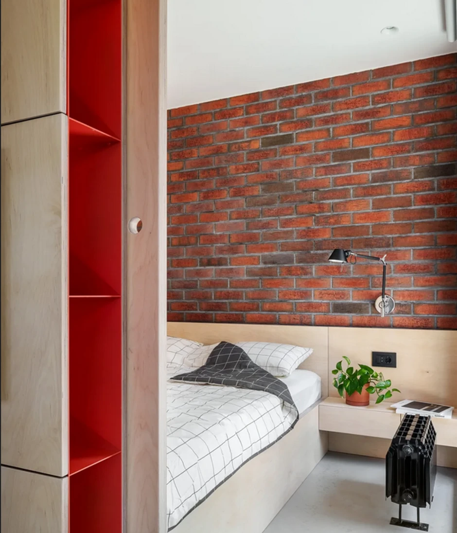 Spavaća soba paralelna je sa dnevnom i od nje odvojena pregradnim drvenim ormanima i kliznim vratima iste obrade, koja kada su zatvorena, grade udoban i topao ambijent za odmor. Zid od dekorativne opeke se ponavlja iza uzgavlja, ali je plafon čitavom dužinom ovog dela stana spušten i obrađen, tako da skriva betonsku konstrukciju. Iz spavaće i dnevne sobe pristupa se malom balkonu, putem kog unutrašnji prostor dobija veliku količinu prirodne svetlosti.