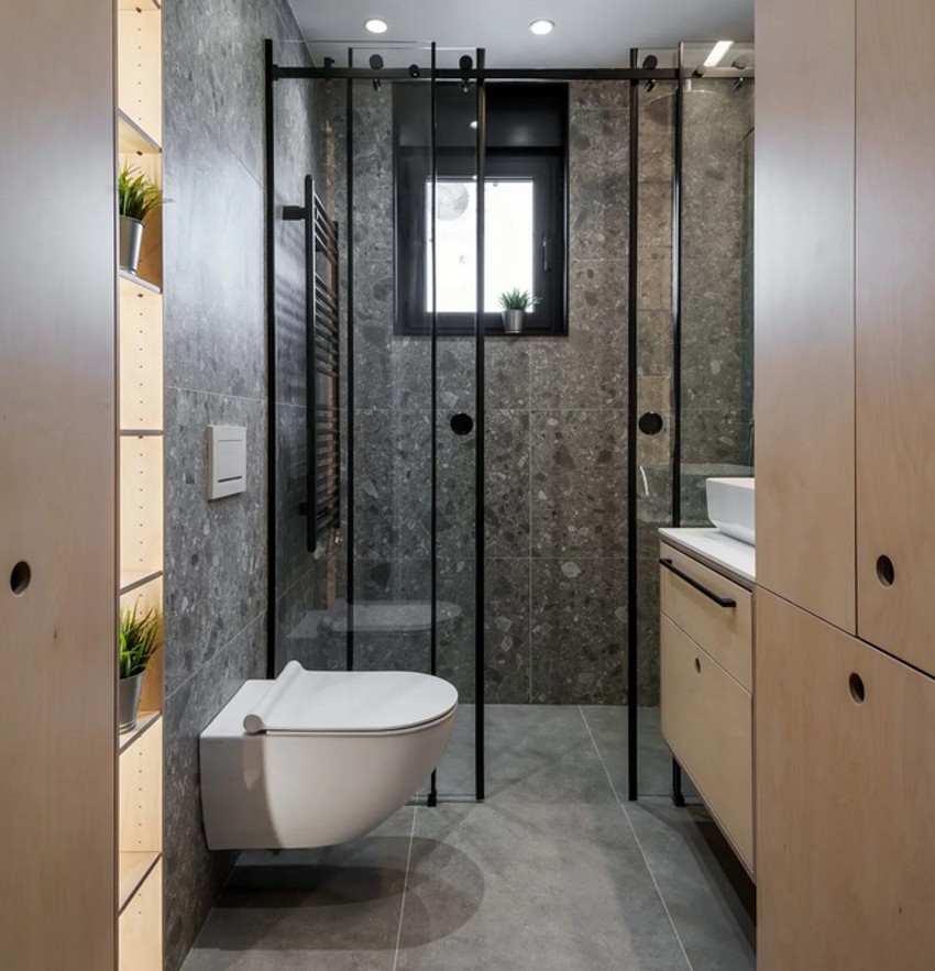 Kupatilo je paralelno sa kuhinjskim prostorom, neutralnih tonova, sa istaknutim zidnim pločicama koje imitiraju teraco kamen i svetlim drvenim elementima iste obrade kao u ostatku stana.