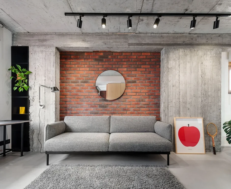Jedinstvenost i prostranost zone kuhinje i dnevnog boravka postignuta je jednakim tretmanom poda i plafona. Industrijski dizajn naglašen je otkrivanjem betonske konstrukcije na plafonu, te vidljivim sistemom kablova, izlivenim sivim podom od mikrocementa i slojevima cigle, betona i belih zidova u dnevnoj sobi. Ovde je, pored dela za opuštanje sa dvosedom i foteljama, formiran mali i diskretan radni prostor, prema arhitektonskom studiju Mycode.arhitektura