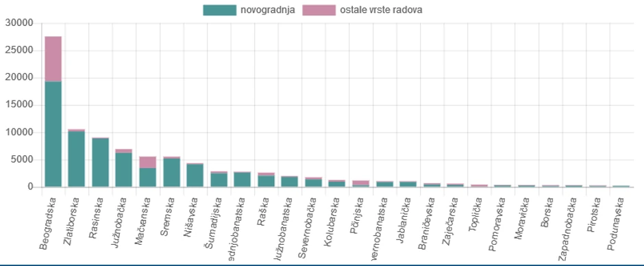 Ako se posmatraju samo zgrade, 79,0 odsto dozvola izdato je za stambene, a 21,0 odsto za nestambene zgrade, dok se kod ostalih građevina najveći deo odnosi na cevovode, komunikacione i električne vodove (75,4 odsto), piše Republički zavod za statistiku.