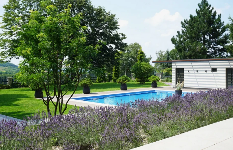 Ovaj ambijent čine prilazni deo i plato, trem, prostor oko otvorenog bazena, zelenilo, skupturalne dizajnirane posude sa biljkama, i odlikuju ga igra različitih tekstura i popločavanja sa akcentovanim potezima u ljubičastom tartanu, rasveta, više zona pogodnih za ručavanje na otvorenom ili udobno sedenje, brižljivo odabran vrtni nameštaj i detalji, prema arhitektonskom studiju Landscape Factory