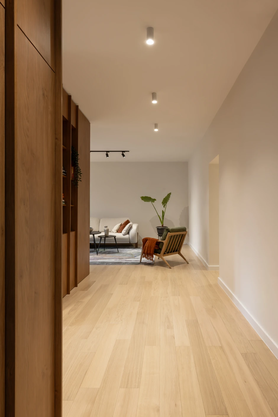 Hodnik je odvojen velikim plakarom, a pogled se odatle pruža ka dnevnom boravku. Kuhinja je postavljena u blizini ulaza, celom dužinom zida do terase, čime je omogućeno prirodno osvetljenje, piše Superprostor.