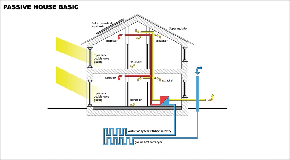 U suštini, ništa se ne prepušta slučaju, zbog čega spoljašnja površina doma mora da bude što manja u odnosu na njenu zapreminu. Iako deluje zanemarljivo, čak se i položaj utičnica i sijalica projektuje prema prostoriji, zbog velikog broja kućnih uređaja koji takođe emituju toplotu. Unutar same kuće, nalazi se mehanički sistem ventilacije koji radi na principu povraćaja toplote.