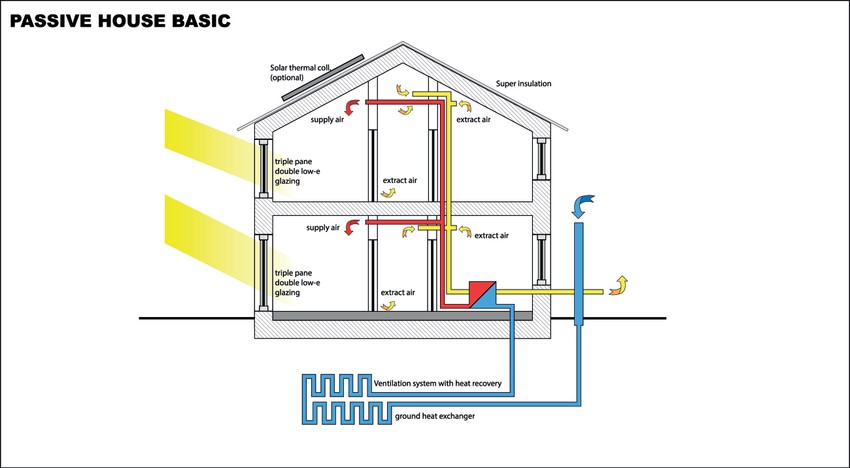 Da bi dobila sertifikat, pasivna kuća ne sme da propušta više vazduha od 0,6 puta zapremine kuće na sat. Tajna toga se krije u najsavremenijoj tehnologiji izolacije, trokomornim prozorima, solarno dogrevanje kroz prozore, uz minimalno dogrevanjem svežim vazduhom.