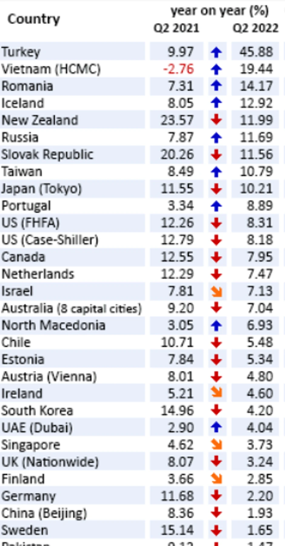 Azijska tržišta su ojačala sa izuzetkom Vijetnama, Tajvana i Japana, dok je u Južnoj Americi rast cena zaustavljen u većini zemalja. Vrlo zanimljiva priča se nastavlja u Turskoj, koja ima skoro 80 odsto godišnje inflacije, najveću u poslednje 24 godine. Nominalno, cene su tamo porasle za nevjerovatnih 161 posto na godišnjem nivou. Jednako tako, ako ne i više, nominalni rast cena nekretnina bio je neverovatan, iznosio je skoro 46 odsto. Prošle godine zabeležili su rast nešto manji od deset posto.