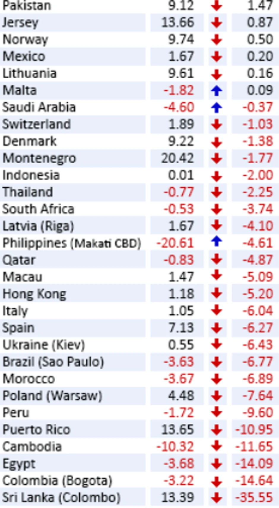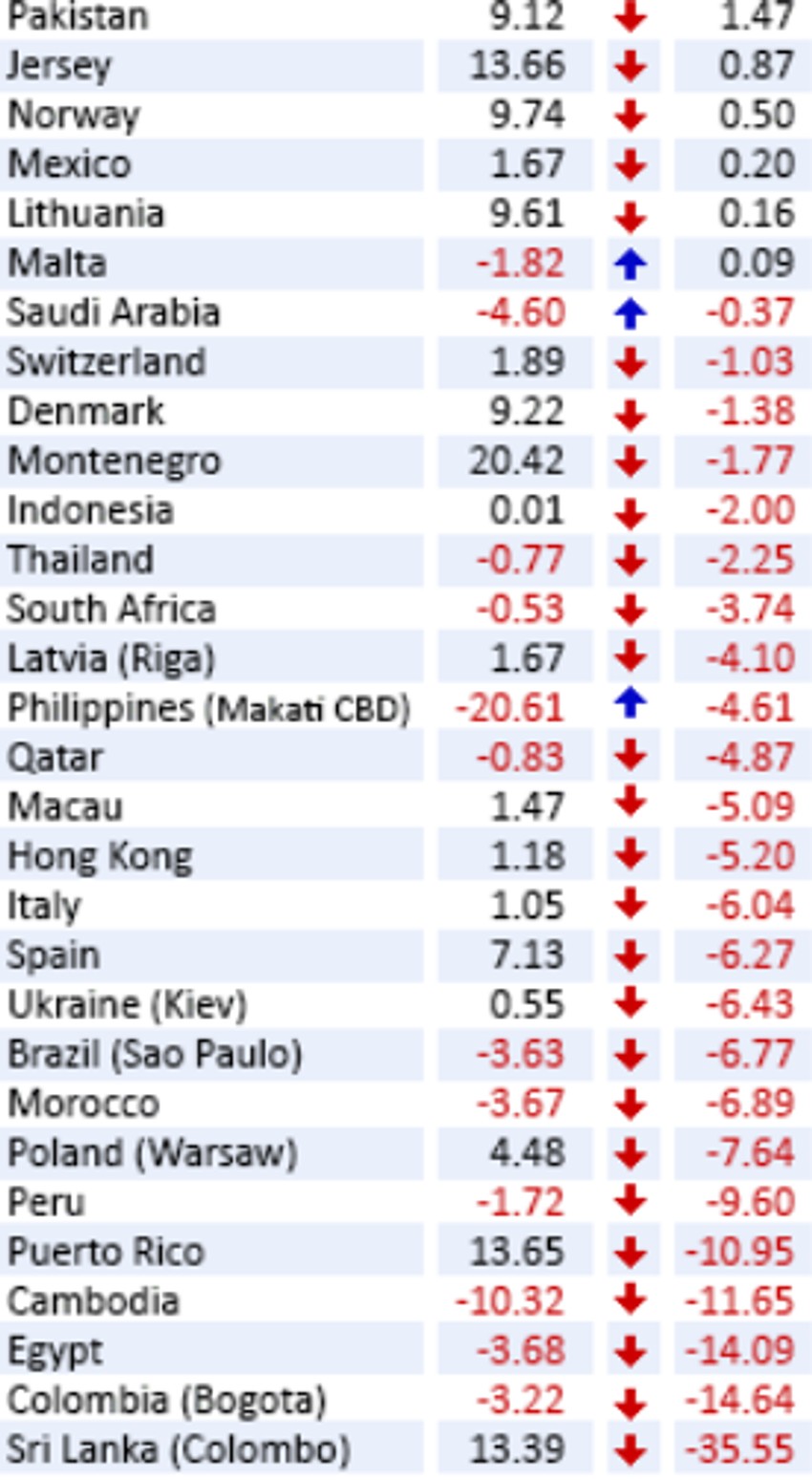 U Evropi je najgore u Poljskoj ili u Varšavi. Dok su tamošnje cene u drugom kvartalu prošle godine realno porasle za 4,5 posto na godišnjem nivou, ove godine su izračunali pad od 7,6 posto. Za tri meseca cijene su pale za 2,7 posto. Preokret se na godišnjem nivou dogodio i u Španiji, gde su cene u drugom kvartalu prošle godine porasle za 7,1 posto, a ove godine pale za 6,27 posto. Slično je bilo i u Italiji, samo što je prošle godine realni godišnji rast bio jedan odsto, ove godine u drugom kvartalu cene nekretnina pale su za više od šest odsto.
