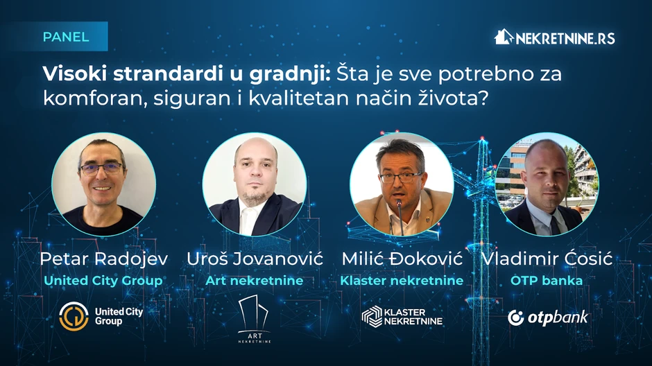 Tema današnjeg panela Nekretnine.rs je bili su standardi u ovoj oblasti, odnosno, šta je sve potrebno da bi se ostvarili visoki standardi u gradnji. Razgovaralo se i o tome šta je sve potrebno za komforan, siguran i kvalitetan način života. Učesnici na panelu bili su Petar Radojev United City Group, Uroš Jovanović iz Art nekretnina, Milić Đoković iz Klaster za nekretnine i Vladimir Ćosić iz OTP banke. Moderator je bila Beba Dragić.