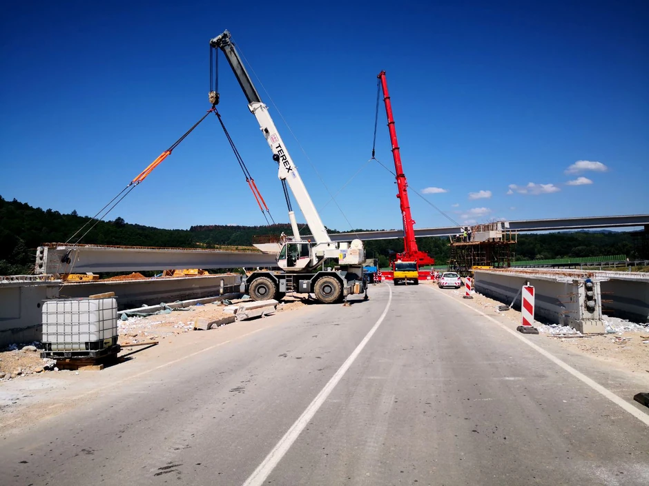 - Radove izvodi ogranak "Integral inženjering Niš", direktor projekta je Miloš Popović. Izvedeno je 65 odsto radova na objektu i 50 odsto radova na izradi nasipa. Radovi se izvode po ubrzanoj dinamici i trenutno smo ispred dinamike oko tri meseca. U toku je montaža prednapregnutih armirano betonskih nosača dužine 25,60 metara i težine 27 tona, paralelno se izvode radovi na poziciji kolovozne ploče i poprečnih nosača. Izvode se zemljani radovi na izradi nasipa, kao i radovi na poziciji odvodnih kanala do recipijenta - podvlači Veljkov.