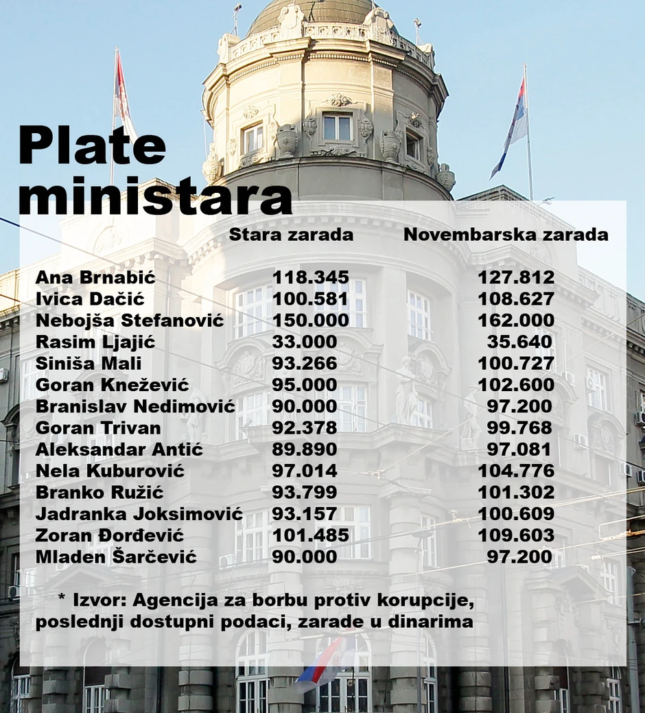 Plata premijerke Ane Brnabić biće veća za oko 10.000 dinara - njena zarada od 118.345 dinara ubuduće će iznositi 127.812 dinara. Potpredsednik Vlade i ministar Ivica Dačić koji je primao 100.581 dinar sada će mesečno inkasirati 108.627, dok će ministar Aleksandar Antić dobiti platu uvećanu za oko 7.000 dinara.
