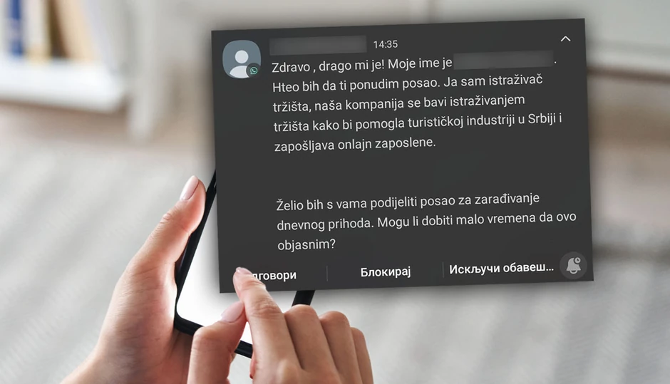 - Hteo bih da ti ponudim posao. Ja sam istraživač tržišta, naša kompanija se bavi istraživanjem tržišta kako bi pomogla turističkoj industriji u Srbiji i zapošljava online zaposlene. Želio bih sa vam podjeliti posao za zarađivanje dnevnog prihoda. Mogu li dobiti malo vremena da ovo objasnim, piše u poruci koju nam je čitalac prosledio.