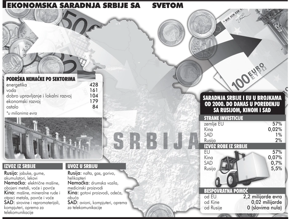 BEOGRAD - Srbija u poslednjih deset godina ima najbolju ekonomsku saradnju sa Nemačkom. Od EU je došlo najviše bespovratne pomoći našoj zemlji, a najviše novca je uloženo u energetiku. S druge strane, Srbija u Evropu izvozi 57 odsto proizvoda. Mnogo manje izvozimo u Rusiju 5,5 odsto, slede Kina i Amerika.
