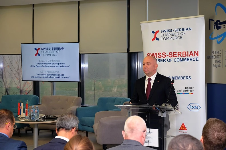 - Švajcarsko-privredna komora koja je organizator današnjeg skupa, takođe, pruža odličnu podršku Vladi Srbije i svima koji se bave inovacijama i digitalizacijom. U procesu digitalizacije celokupne uprave u Srbiji, koja je prioritet Vlade Srbije, računamo na pomoć privrednih giganata iz Švajcarske koji već rade u Srbiji, kao i na njihovu stručnu i mentorsku pomoć u razvoju inovativnog preduzetništva - rekao je Popović i dodao da u okviru NT parka u Beogradu posluju tri švajcarske kompanije koje zapošljavaju više od 100 inženjera iz Srbije.Ambasador Švajcarske u Srbiji Filip Ge rekao je da je saradnja Srbije i Švajcarske trenutno najjača u oblasti istraživanja i komunikacionih tehnologija, kao i da dve zemlje sarađuju u 22 projekta čija je ukupna vrednost 250 miliona evra.