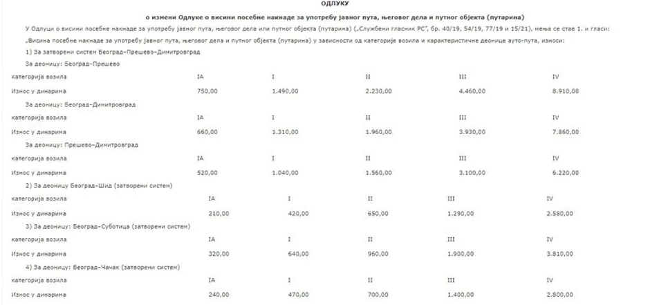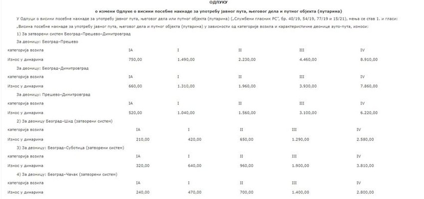 Za kategoriju II koštaće 700 dinara umesto dosadašnjih 640 dinara, za kategoriju III 1.400 umesto 1.270 dinara i za kategoriju IV 2.800 umesto 2.560 dinara. Promenjene su i vrednosti popusta za avansnu uplatu unetu na uređaj za elektronsku naplatu putarina (ENP).