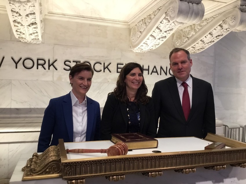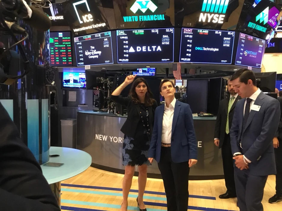 Predsednica Vlade Srbije Ana Brnabić obišla je Njujoršku berzu i sastala se sa predsednicom berze Stejsi Kaningham. Kaningham je postavljena u maju ove godine i ujedno prva žena koja vodi Njujoršku berzu još od njenog osnivanja pre 226 godina.