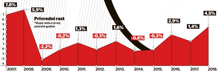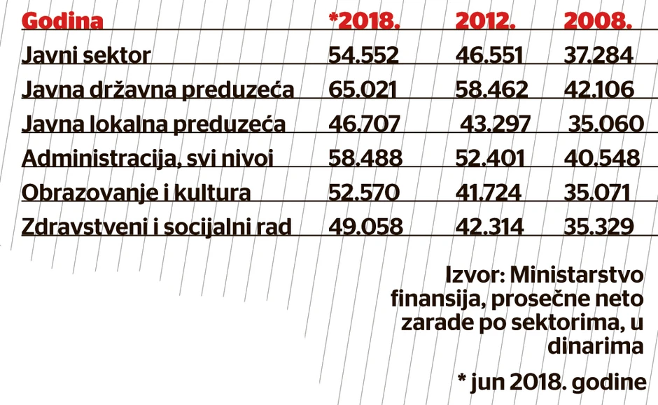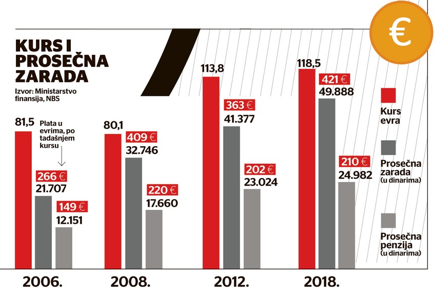 Krenimo redom. Privredni rast ove godine iznosiće 4,2 odsto, što je najveći godišnji rast BDP Srbije od početka svetske krize 2008. Nekoliko godina tokom vladavine SNS BDP je imao negativne stope rasta, a značajniji rast je započeo 2014. Minimalna zarada, koju prima oko 300.000 ljudi, povećana je sa 13.000 dinara u 2008. godini na 17.748 dinara u 2012. te 27.000 dinara, koliko iznosi danas. Prosečna zarada u zemlji za deset godina porasla je u dinarima za 28.000, a u evrima za 155 evra (vidi tabelu). Ako poredimo, međutim, prosečnu zaradu u 2008. i danas, ona je u evrima danas veća tek za 10 evra. Domaća valuta značajno je oslabila od 2008, ali je činjenica i da se guverner Jorgovanka Tabaković može pohvaliti stabilnim kursom u protekle dve godine.