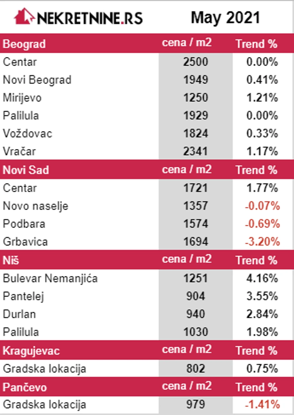 Najnoviji podaci sa sajta nekretnine.rs pokazuju da su cene porasle u Beogradu, Kragujevcu, Nišu i centru Novog Sada, dok su cene kvadrata pale u Pančevu, kao i u nekoliko novosadskih naselja.