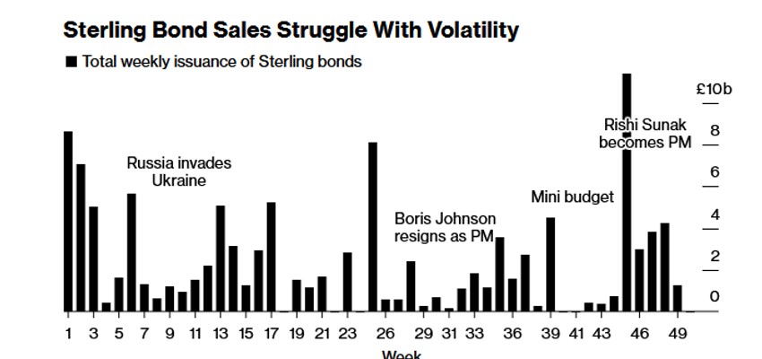 Mnoge prodaje obveznica u sterlingima su stavljene na čekanje zbog različitih napada ovogodišnje nestabilnosti, bez dogovora u dve nedelje nakon mini-budžeta i krize ulaganja vođenih obavezama koja je zahtevala intervenciju BOE.