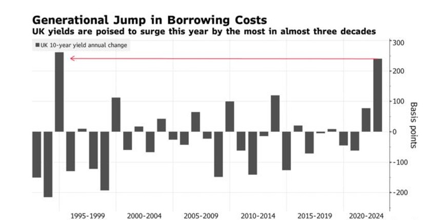 Referentni 10-godišnji prinosi u Velikoj Britaniji su ove godine porasli za dva procentna poena, najviše od 1994. Banka Engleske je podigla kamatne stope najbržim tempom u više od tri decenije kako bi zaustavila dvocifrenu inflaciju.