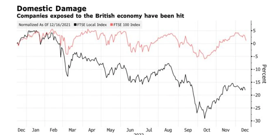 Nadmašnost britanskih akcija ograničena je na bluechips. FTSE 250 midcap indeks i još jedno merilo koje prati akcije usmerene na domaće tržište, FTSE lokalni indeks Velike Britanije, pali su za više od 20 odsto od početka godine do danas, najviše od globalne finansijske krize 2008. godine.