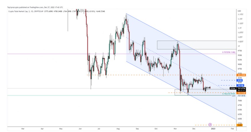 Tokom zadnja dva meseca 2022. godine odvija se borba oko zone od 763 milijarde dolara koja trenutno predstavlja čvrstu obranu bikova. Ako popusti ta linija odbrane, medvedi nemaju prepreka u daljnjem spuštanju cene kripto tržišta do zone 693 milijarde dolara i nakon toga čak 565 milijardi dolara. Još uvek se ne vidi oporavak ukupnog tržišta.
