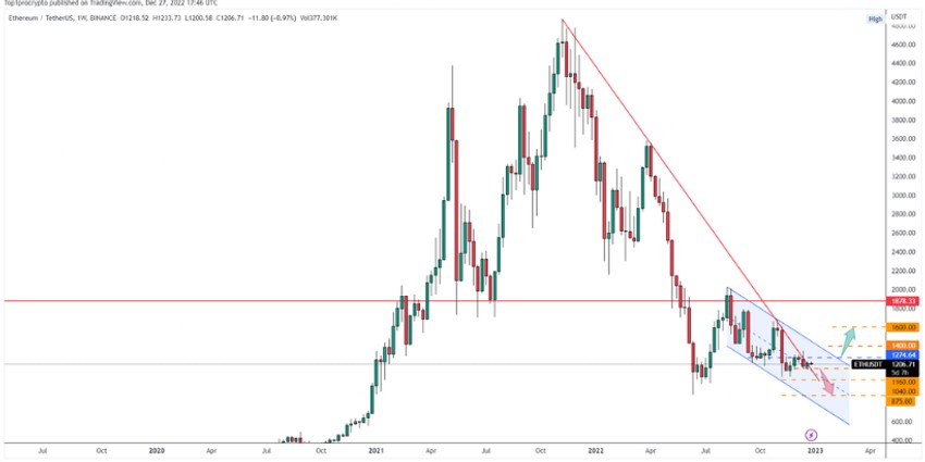 Ether je prošle nedelje završio rastom od 2,9 odsto od 1.183 dolara početkom nedelje do 1.218 nedelje na kraju. Ether se takođe još uvek nalazi na području pod kontrolom medveda te se kreće u padajućem kanalu.