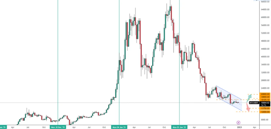 Bitcoin je proše nedelje završio minimalnim rastom od 0,55 odsto od 16.739 dolara početkom do 16.832 dolara na kraju nedelje. Bikovi su ponovo uspeli odbraniti zonu 16.300 dolara. Index straha i pohlepe je još uvek u zoni straha, a to i dalje predstavlja priliku za kupovinu.