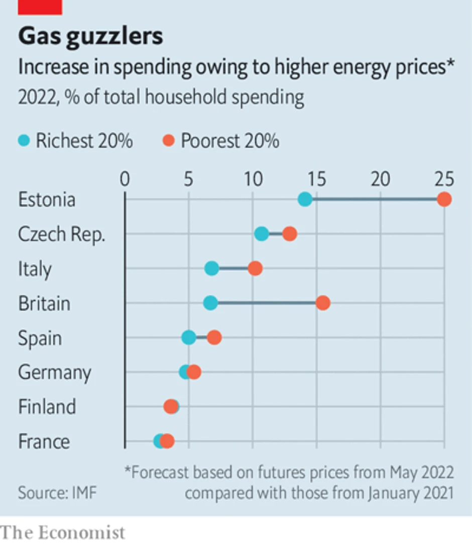 Evropa se suočava sa ogromnim šokom cena energije. Ali nisu svi Evropljani spremni da vide isti udarac na svoj životni standard. Prema procenama MMF-a, opterećenje za prosečnu porodicu u Finskoj biće ekvivalentno dodatnih 4 odsto potrošnje domaćinstva. Slika je znatno mračnija na dva sata vožnje trajektom preko Baltičkog mora. U Estoniji se domaćinstva suočavaju sa udarom od oko 20 odsto.