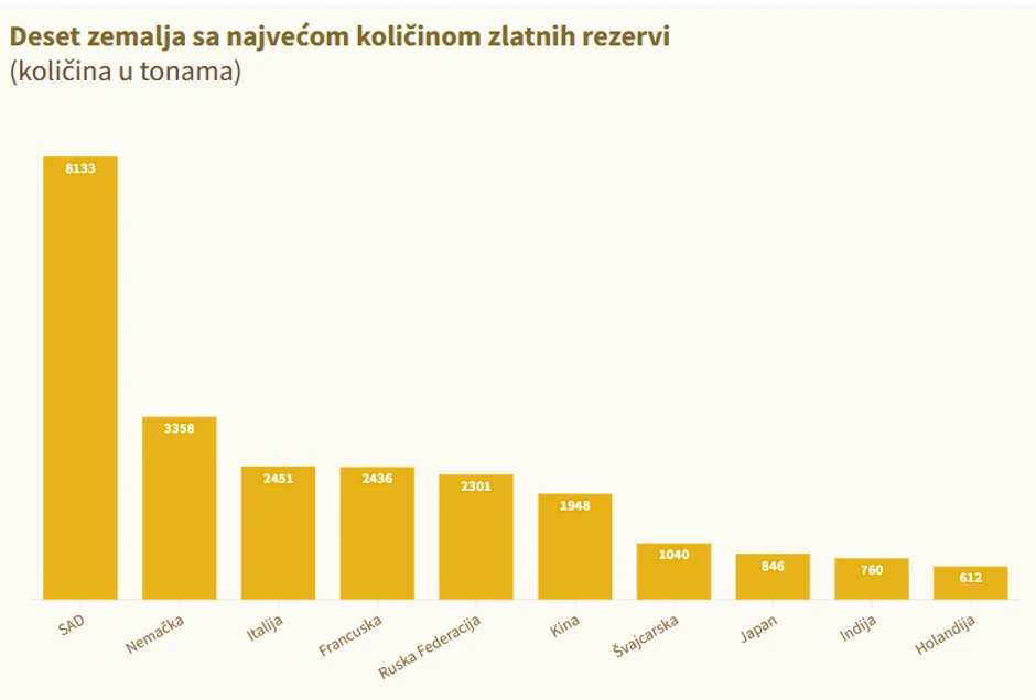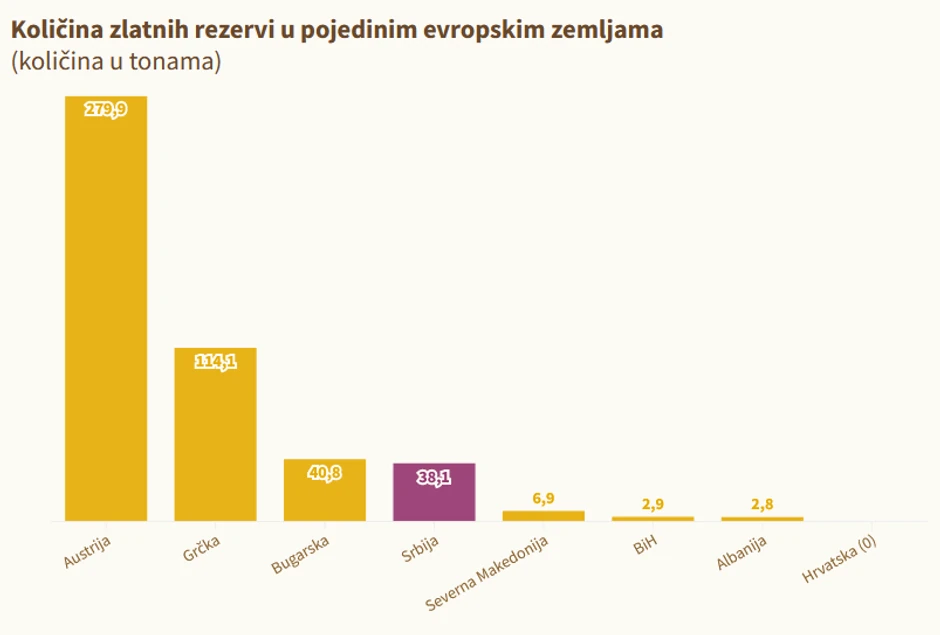Prema poslednjim podacima Svetskog saveta za zlato, Srbija je sa 38,1 tonom zlatnih poluga vodeća zemlja u regionu po količinama tog plemenitog metala deponovanog u trezorima Narodne banke Srbije. Na drugom mestu na Balkanu je Severna Makedonija sa 6,9 tona zlatnih rezervi, Slovenija im 3,2 tone, Bosna i Hercegovina tri tone zlata, a Crna Gora 1,09 tona, dok Hrvatska nema rezerve u zlatu, jer ih je rasprodala još 2001. godine.