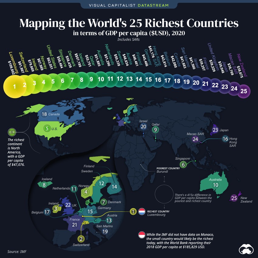 Najbogatija zemlja na svetu je Luksemburg sa 109,000 dolara BDP po glavi stanovnika, dok je najsiromašnija zemlja Burundi sa samo 264 dolara.