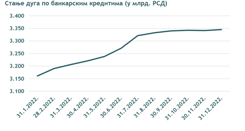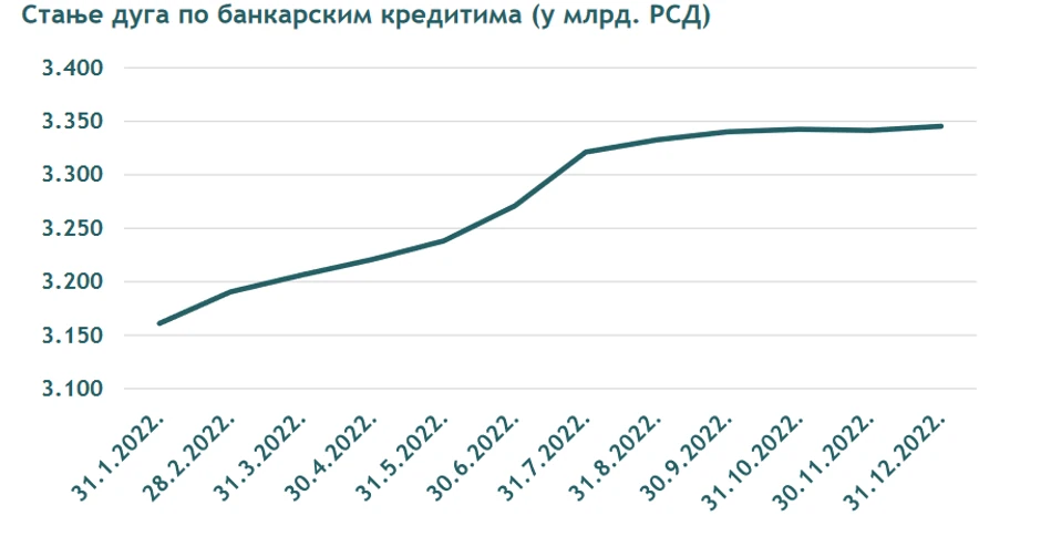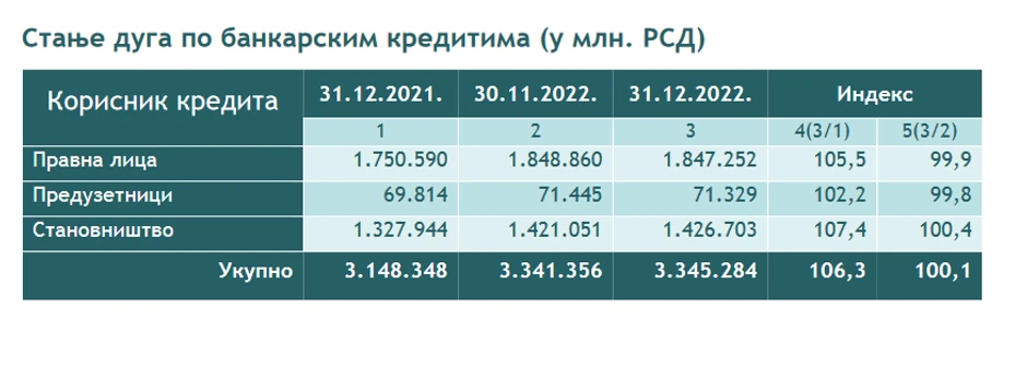 Zvanična statistika stanja duga prema bankarskim kreditima za pravna lica u decembru mesecu je iznosila 1.750.590 miliona dinara, za preduzetnike 69. 814 miliona dinara, a za stanovništvo 1.327.944 miliona dinara.