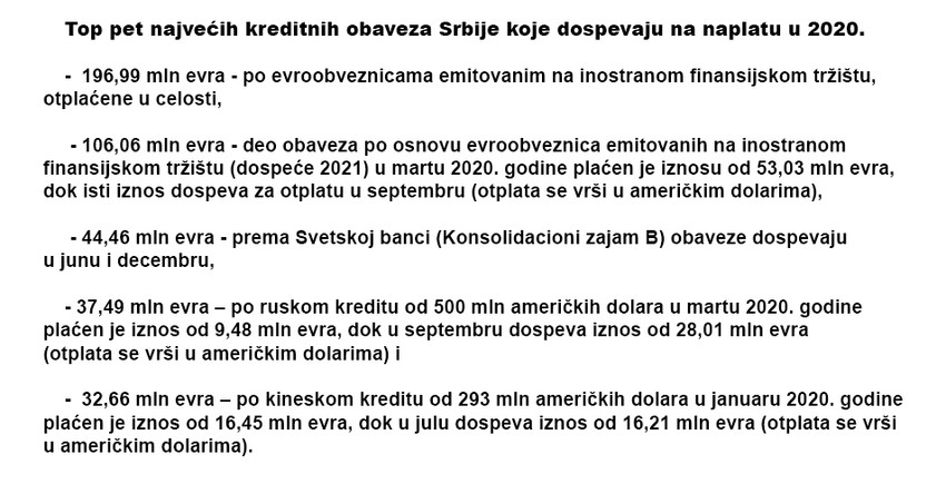 U Narodnoj banci Srbije potrdili su nam da se među top pet najvećih kreditnih obaveza koje nam ove godine dolaze na naplatu nalaze krediti iz novijeg vremena, prema Rusiji, Svetskoj banci, Kini (detaljnije pogledajte u tabeli). Najveći deo obaveza, među prvih pet, 106 miliona evra imamo po osnovu emitovanih evroobveznica. Polovinu smo platili, dok drugi deo dospeva u septembru.