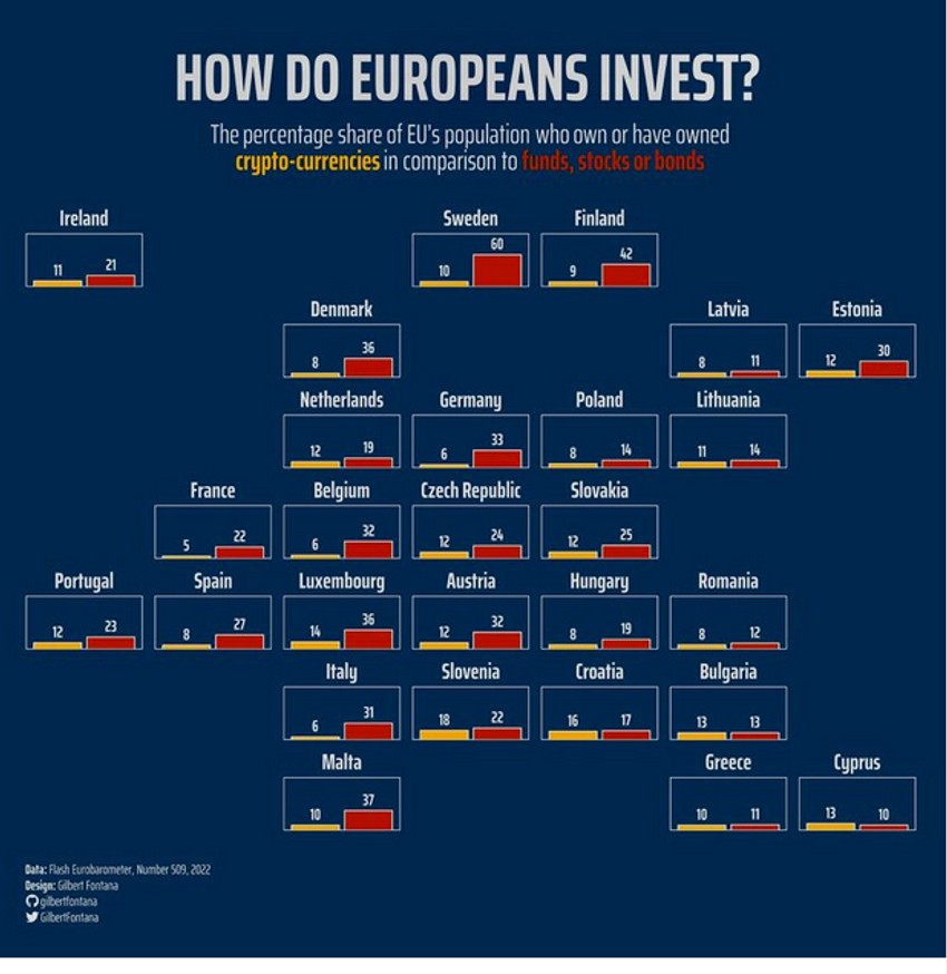 Ova infografika Gilberta Fontane prikazuje sklonost investiranju građana EU koristeći se podacima Eurobarometra te upoređuje izloženost stanovnika pojedinih država EU kriptovalutama kao i njihovo ulaganje u deonice, fondove i obveznice.