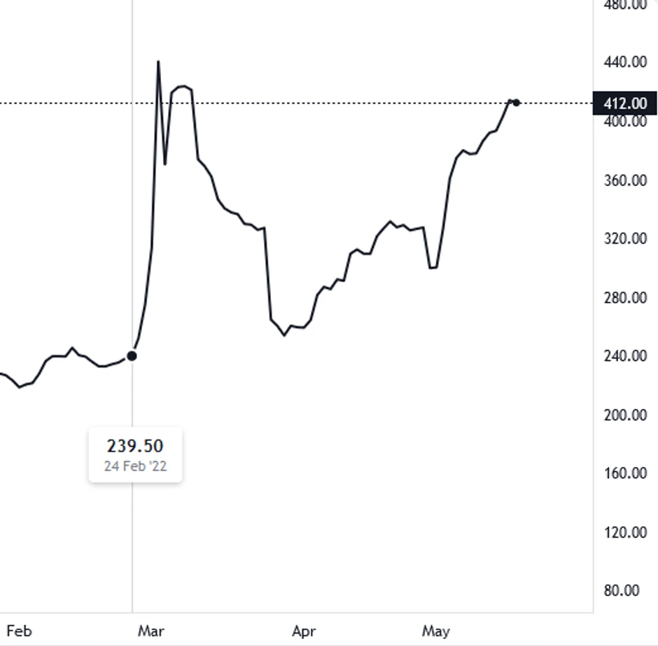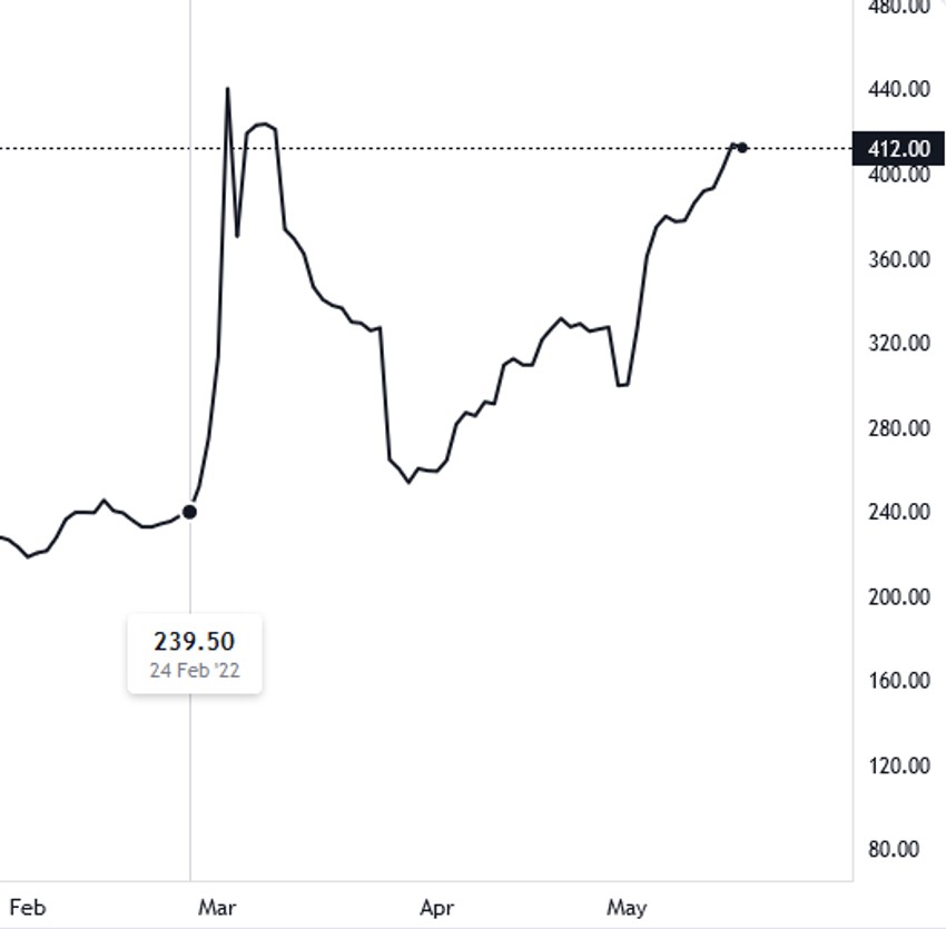Cene uglja koje su se delom oporavile od šoka izazvanog energetskom neizvesnošću s'kraja 2021. godine, rat u Ukrajini i sankcije Rusiji dodatno su zakomplikovale stanje na tržištu. Istovremeno desila se i promena trgovinskih tokova jer su EU i Japan počeli da traže alternativne načine snabdevanja iz Australije, Kolumbije, Indonezije, Južne Afrike i Sjedinjenih Država. Od tada je cena ponovo ušla u trend rasta