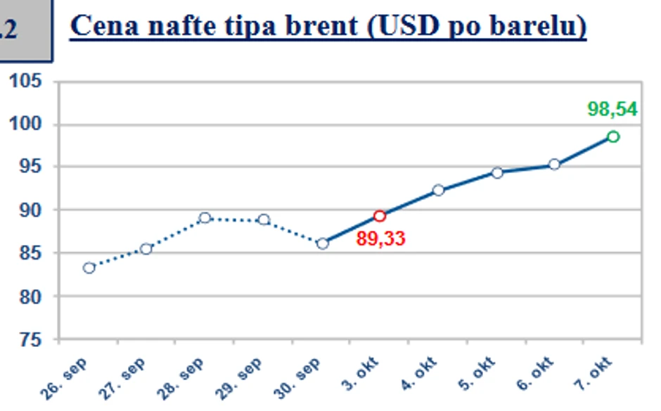 U najnovijem izveštaju Narodne banke Srbije, pod nazivom "Pregled dešavanja na svetskom finansijskom tržištu", ističe se da je cena nafte tipa Brent, od 26. septembra do 7. oktobra, porasla za 14,38 odsto i kretala se u rasponu od 89,33 do 98,54 američka dolara po barelu.