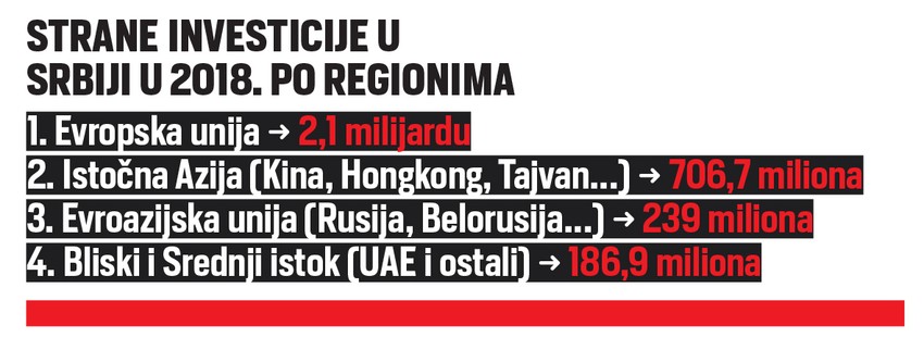 Naime, iz Evropske unije su tokom prošle godine stigle investicije u iznosu od 2,1 milijarde evra, što je više od ukupnih zajedničkih ulaganja iz Istočne Azije (Kina, Hongkong, Tajvan) – 706,7 miliona evra, Evroazijske unije (Rusija, Belorusija) - 239 miliona evra, i sa Bliskog i Srednjeg Istoka (UAE i ostali) – 186,9 miliona evra.