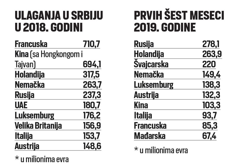 Na primer, iz Francuske su tokom 2018. stigle investicije vredne 710,7 miliona evra, Holandija je uložila 317,5 miliona, a Nemačka 263,7 miliona evra.