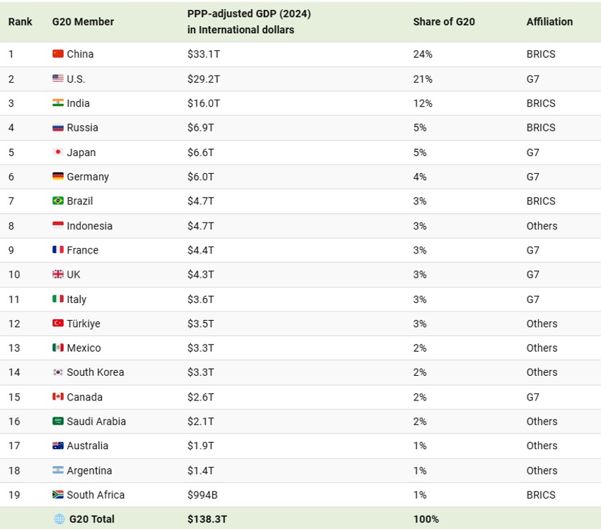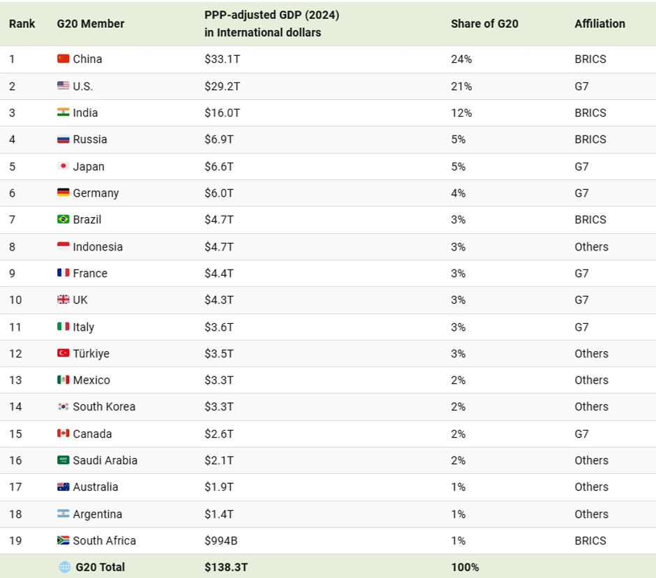 Ovaj grafikon prikazuje vrednost BDP-a svake članice G20 u 2024. godini, prilagođenu prema PPP. Podaci su preuzeti iz Međunarodnog monetarnog fonda u oktobru 2024.