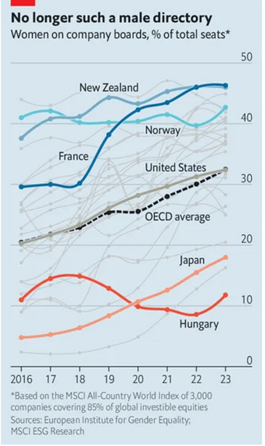 Britanske kompanije FTSE 350 su prošle godine u proseku dostigle taj nivo. Japan, gde samo 18% direktora čine žene, nedavno je rekao velikim preduzećima da dođu do 30% do 2030. godine. Američka ustavna nesklonost kvotama osuđuje slične napore. Ali njegov tržišni regulator želi da kompanije obelodane statističke podatke o raznolikosti, što bi neke moglo osramotiti da krenu u akciju.