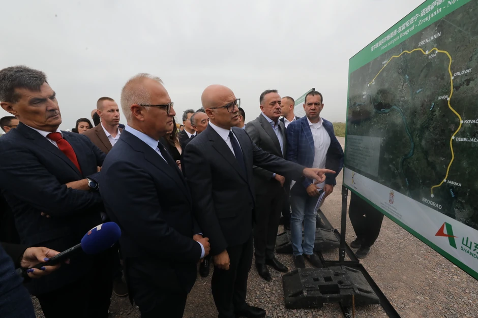 Predsednik Vlade Srbije obilazi radove na delu između Glogonjskog i Jabučkog rita, zajedno sa generalnim sekretarom Provincije Šandong Li Vuom i predsednikom kompanije Šandog hajspid grupe Vang Šifengom, a prisutni su i ministar građevinarstva, saobraćaja i infrastrukture Goran Vesić i v.d. direktora "Koridori Srbije" Aleksandar Antić.