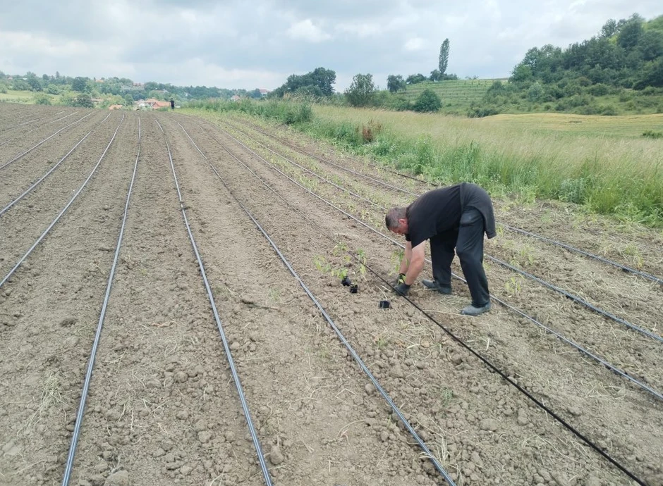 Zatičemo i nekoliko radnika na uređenoj njivi od oko 25 ari, sa već postavljenim crevima za sistem kap po kap i posađenih dva reda.