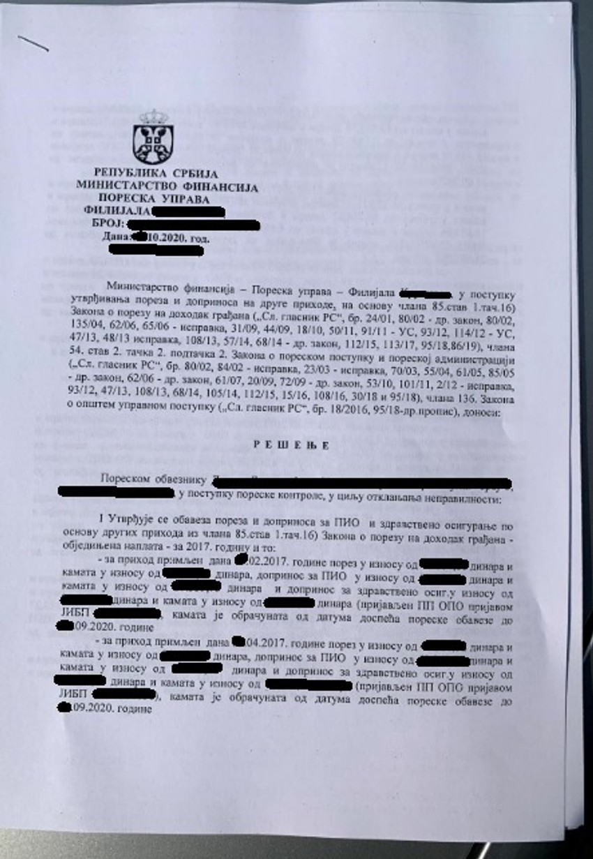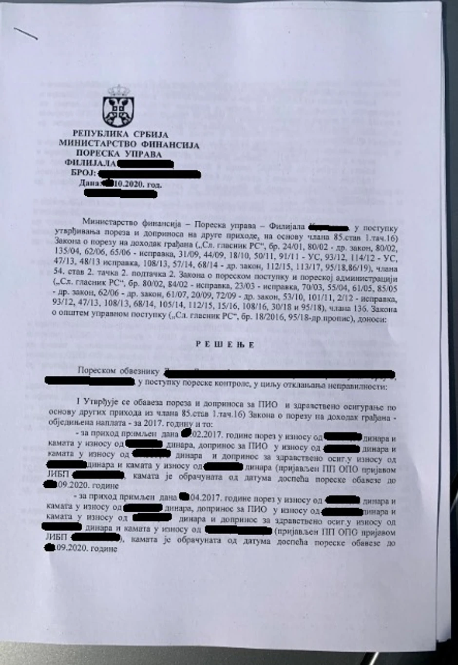 Fejsbuk grupa Inicijativa radnika na internetu objavila je celokupno rešenje Poreske uprave kojem je frilenseru retroaktivno obračunat porez. Reč je o poreskom zaduženju za protekle četiri godine.