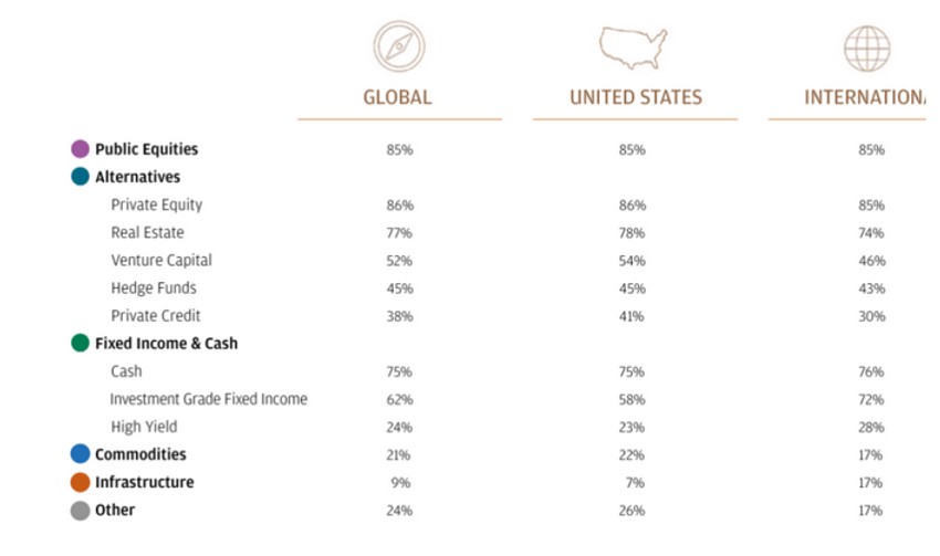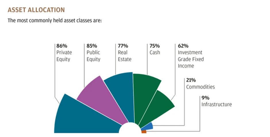 J.P. Morgan (jedna od najmoćnijih finansijskih grupa u SAD) analizirao je strukturu portfelja 190 porodičnih firmi iz celog sveta, sa neto vrednošću imovine od 50 miliona do iznad 1 milijarde dolara. Prema ovom izveštaju za 2024. godinu bogataši su najviše investirali u privatnu imovinu i to 86%. Njih 85% se izjasnilo da poseduje akcije, 77 % ulaže u nekretnine, a 75 % čuva imovinu u gotovini. Oko 62% ulaže u investicije sa fiksnim prihodom, 21% u robu, dok 9% ispitanika investira u infrastrukturu.